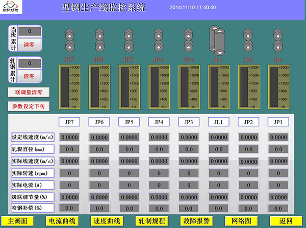 系统由PLC与上位机之间实现网络化控制与通讯,构成先进的全数字化二级计算机控制系统。粗轧区实现速度、压下和道次自动控制功能;精轧区实现套高闭环控制;上位机根据工艺要求,进行轧制规程设定,实时监控。